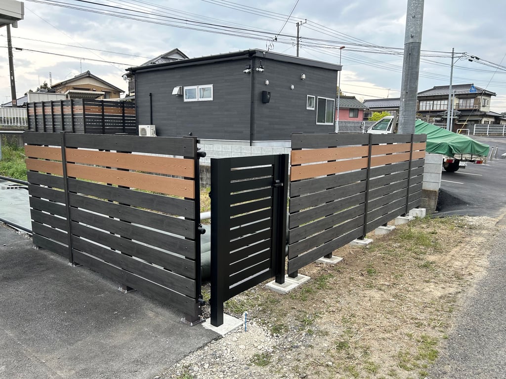 特選車駐車場には樹脂製フェンスを設置して、店舗敷地出入り口にはサンポールのアーチポールと上下式リフターも設置しました。