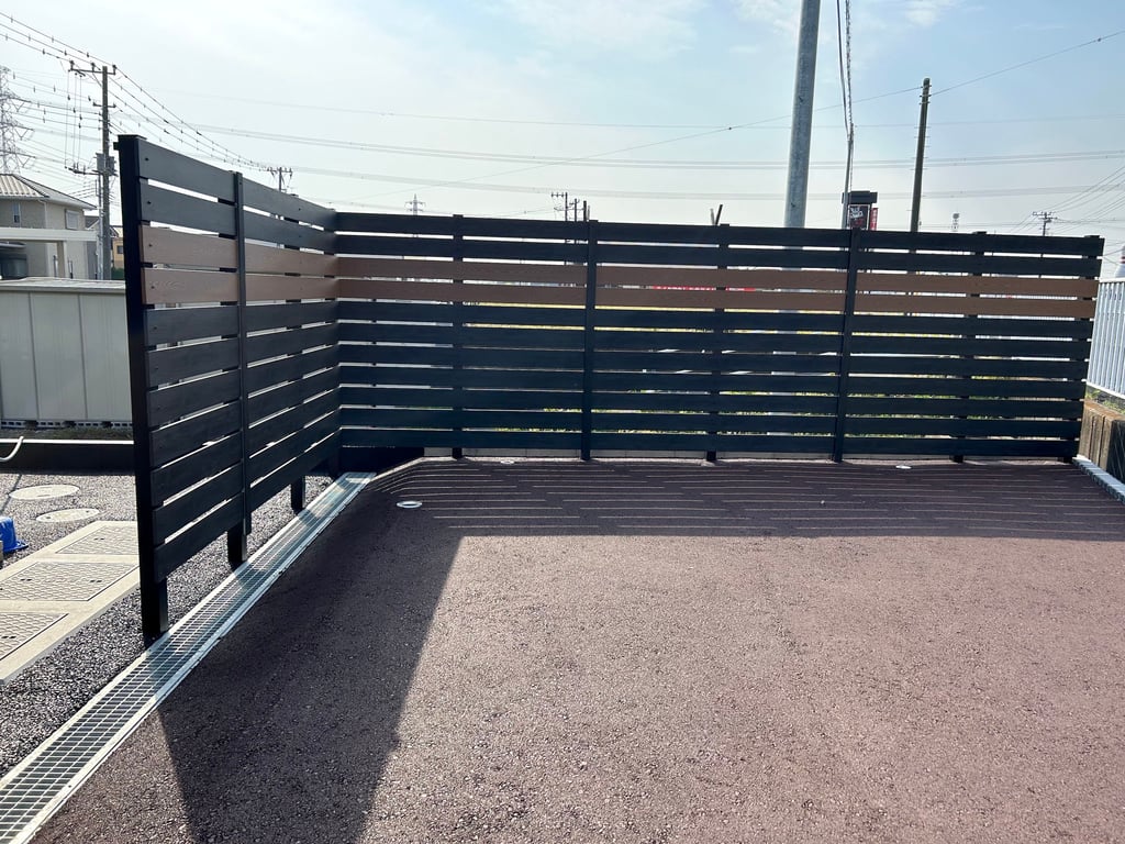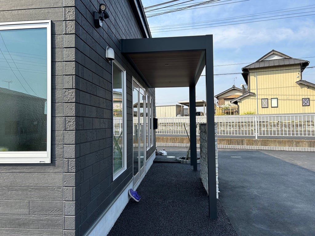 中古車新店舗の外構工事です。店舗入り口にはタカショーホームヤードルーフⅡを屋根代わりに設置しました。