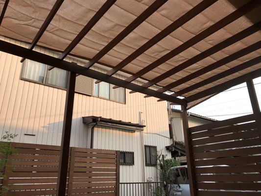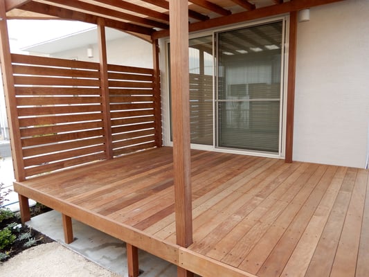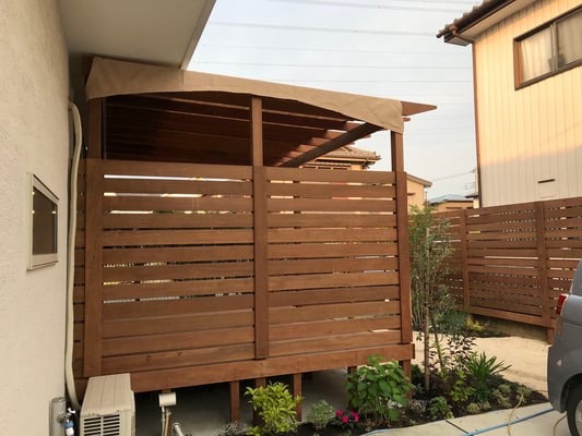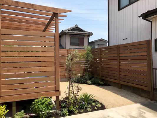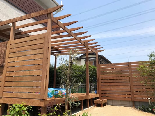 プライバシーを守りながら、天気の良い日はゆっくり過ごせる広いウッドデッキ・フェンスと陽よけにもなるパーゴラを天然木イタウバ材で創りました。耐用年数はノーメンテで約30年です。