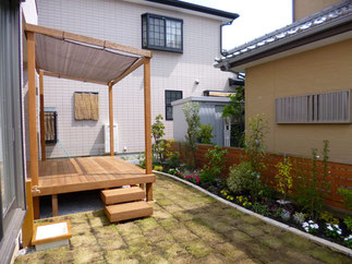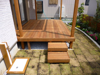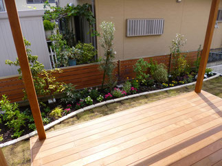 ハードウッドのデッキと芝生・植栽でリビングからの眺めが一変しました。