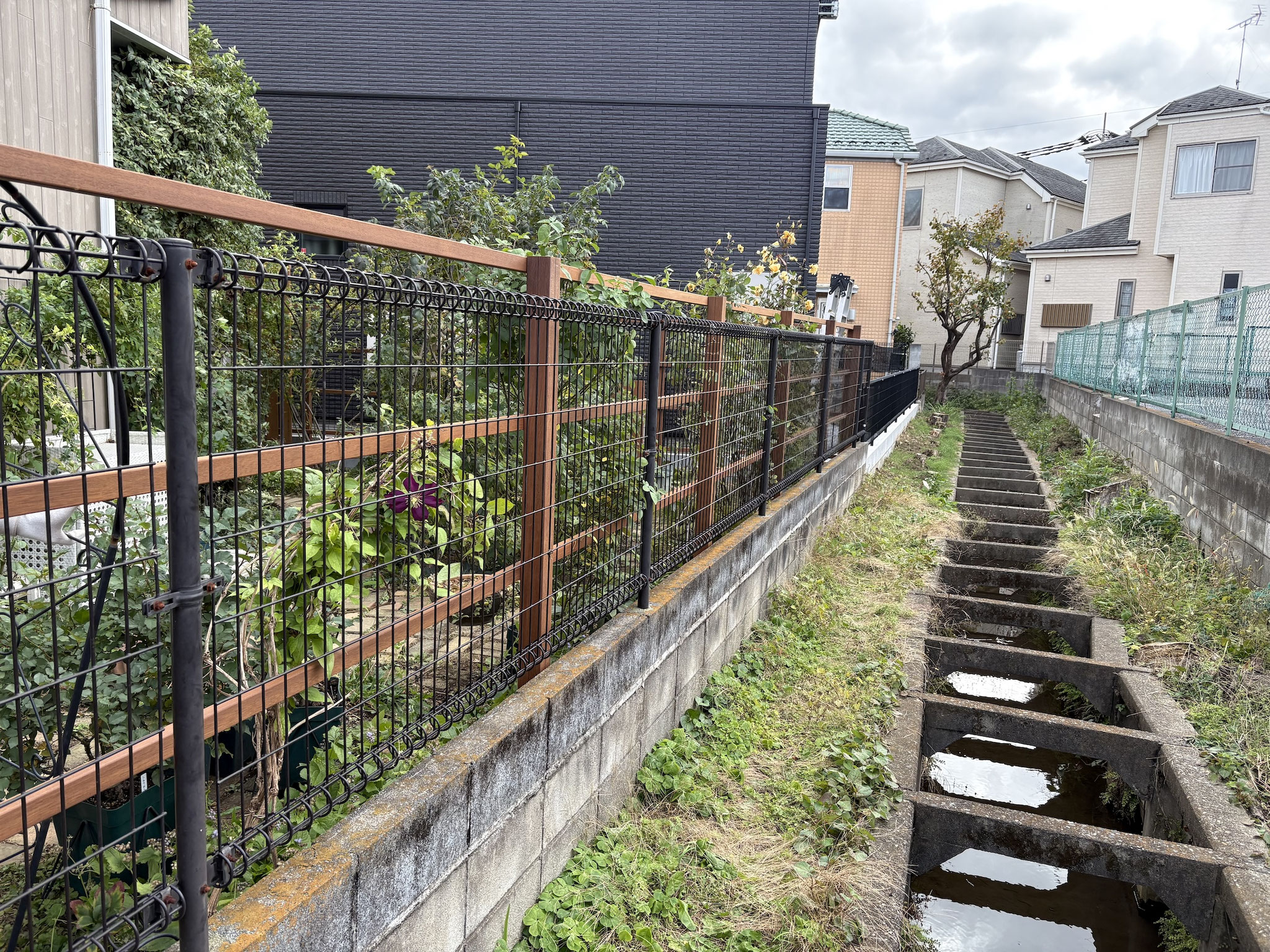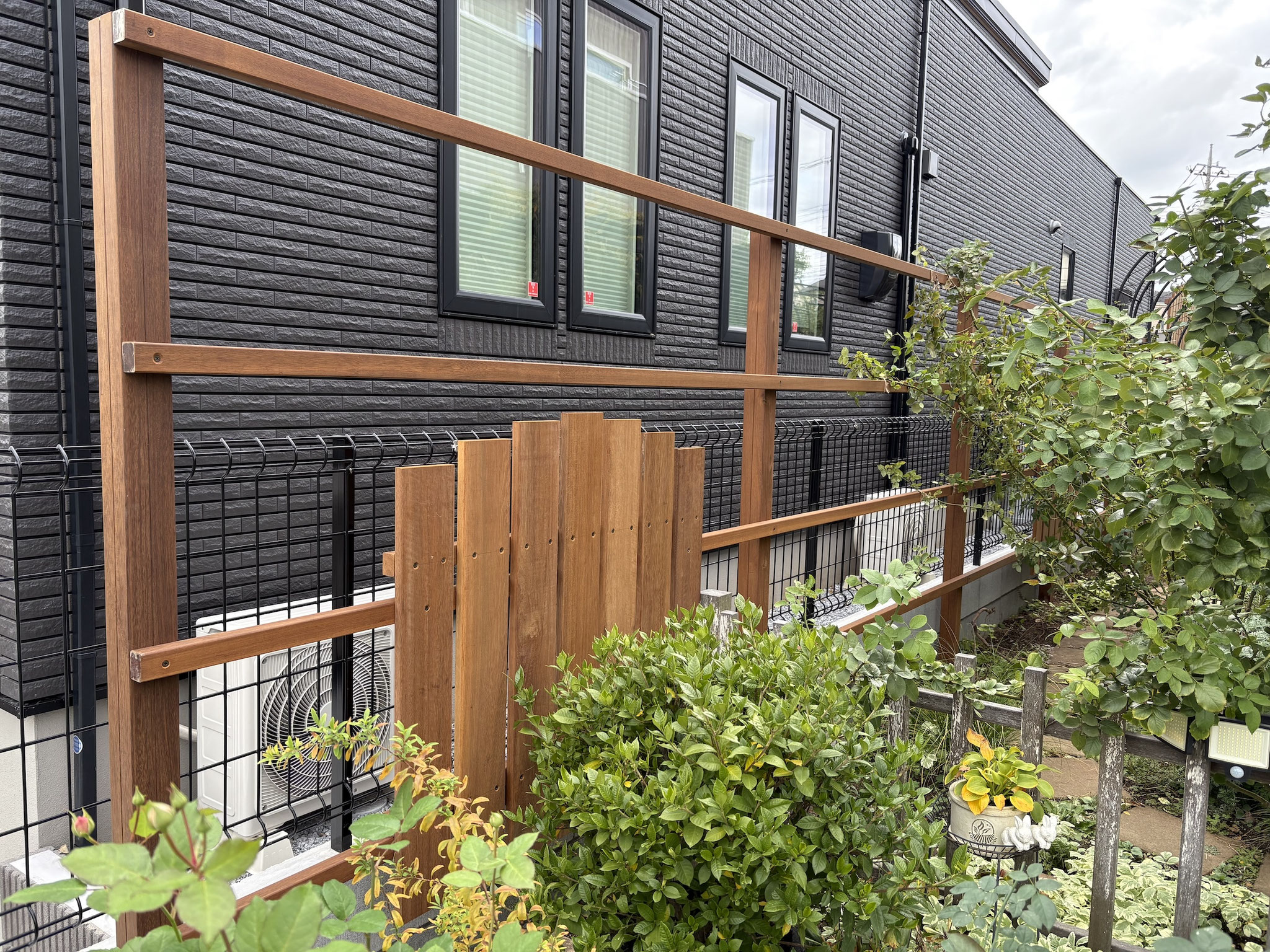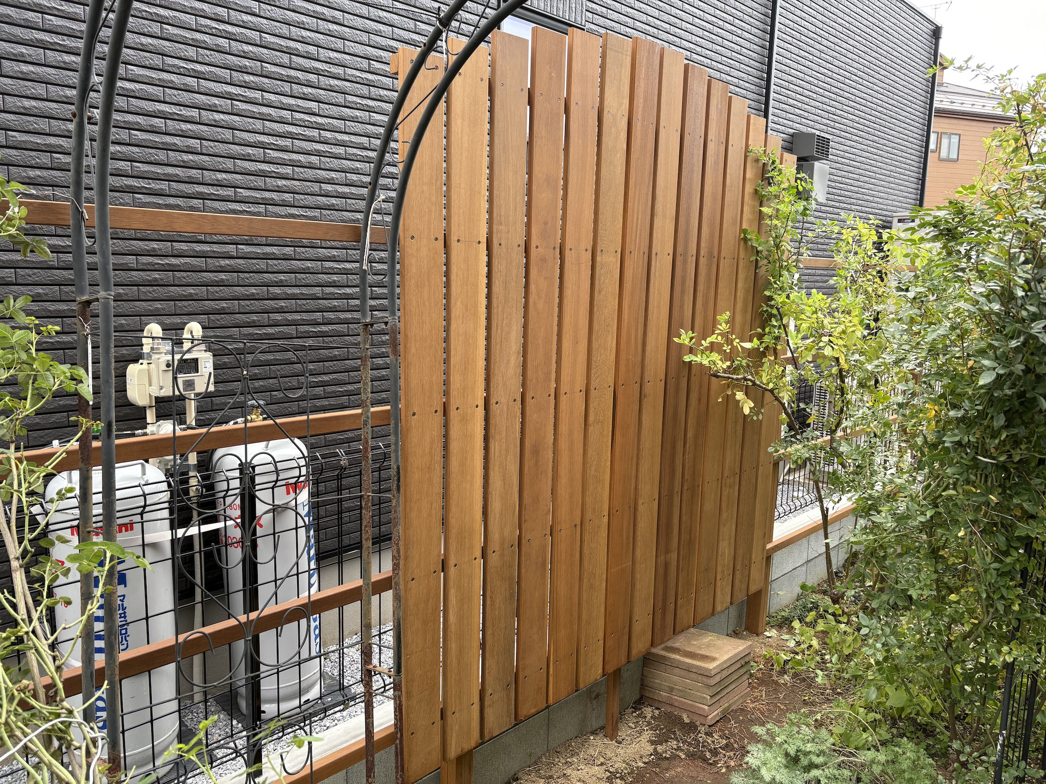 今回はお隣にあった家が建て直しになりましたので、境界部分のウッドフェンスを夏も暑くならないウリン材で薔薇に優しい風通しの良いフェンスを創りました。