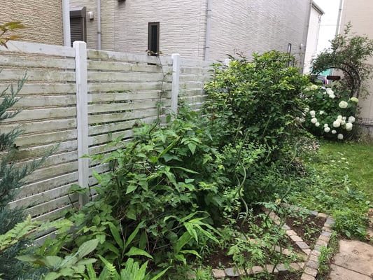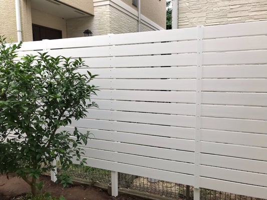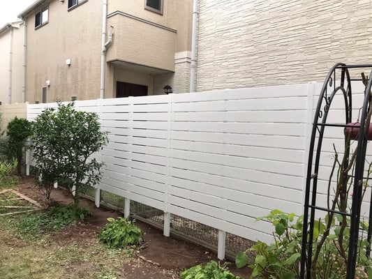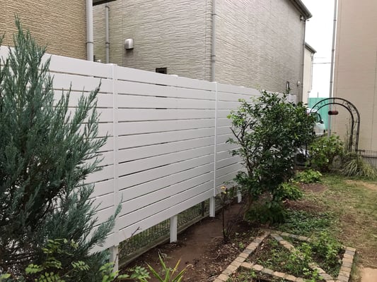 数年前にお客様が建てられたウッドフェンスが腐って倒れそうなので、メンテのいらない樹脂フェンス・アーバンフェンスUV+シボ色ピュアホワイトを設置しました。お子様が遊ぶボールなどが当たらない場所にはカラーが豊富で長持ちする樹脂フェンスがいいですね。今回のフェンスは表面に木目模様を加工したシボタイプです。