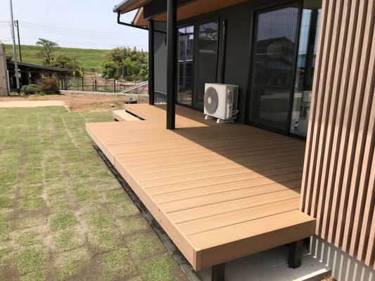 広い敷地のゆったりとした家にLIXIL樹ら楽ステージ木彫を設置し、庭への出入り用に1.5間のローデッキを階段としました。