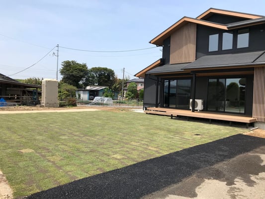 また、元の家があった部分115㎡にはトヨタ改良高麗芝TM9を敷きました。下地には排水補助としっかりした地盤を作るために山砂(笠間砂)を敷き均し転圧後不陸調整しました。目砂には細めの川砂を使いました。