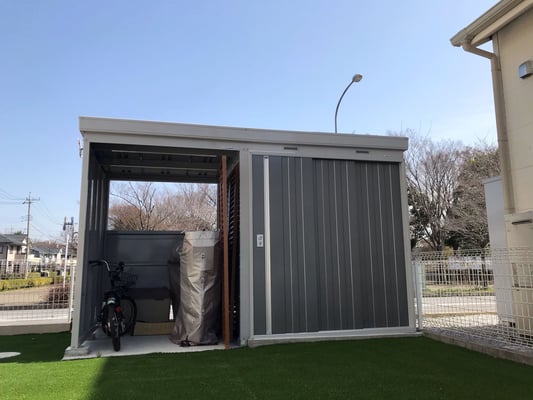 掃き出し窓から出るコンクリートステップの解体が大変でしたが、スッキリ広い人工芝とウッドデッキのお庭と自転車置き場が付いたイナバ物置ネクスタウィズでたっぷり収納できて、通りからの目隠しにもなりました。