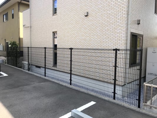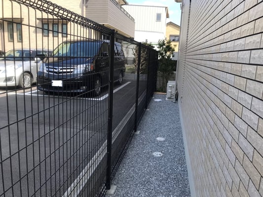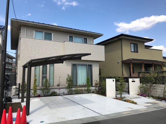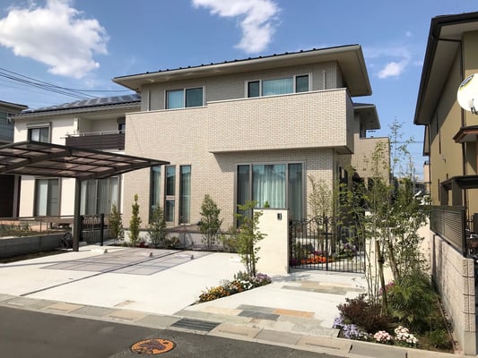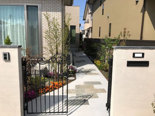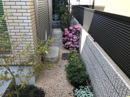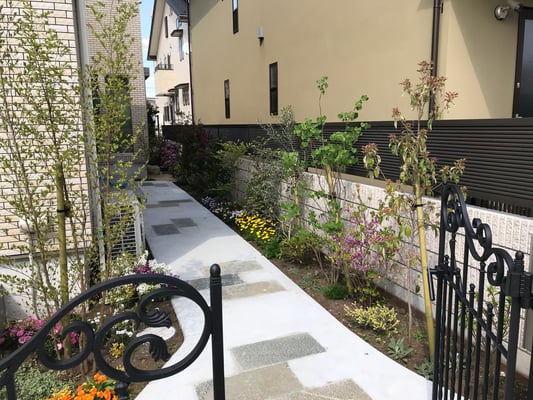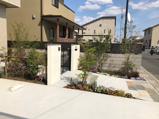 広めな2台分の駐車スペースを確保しながら、植栽をできる限り多く入れました。アオダモとハイノキの高木やマルバノキ・トキワエゴノキ・オリーブ等中木とラベンダーや草花が馴染む初夏にはさらに気持ちの良い空間になると思います。