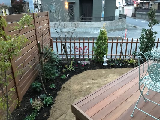 ガーデンにはウリン材で軽い印象のフェンスと目隠しの為のしっかりしたフェンスを作りました。