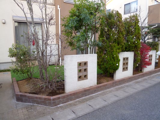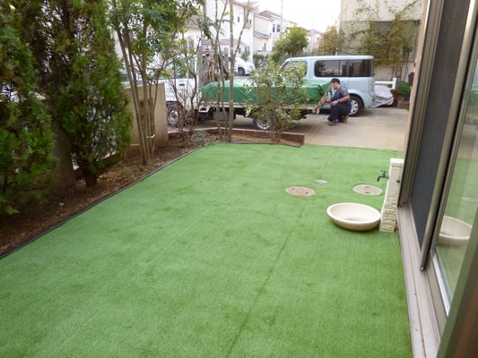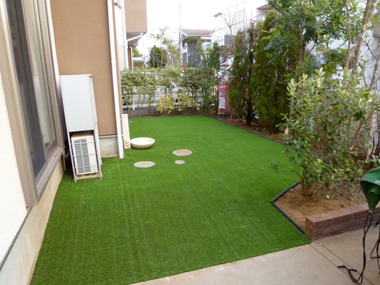 お庭の土が道路に流出するのを防ぐために、レンガを積んで人工芝を貼りました。