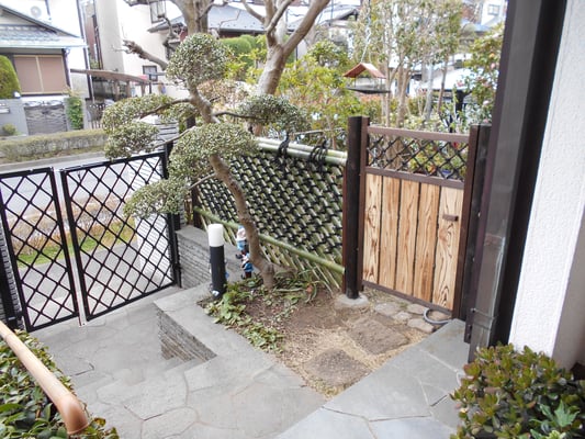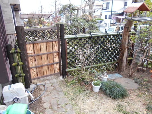 以前作られた金閣寺垣が壊れたので、家の手直しのタイミングで竹垣の工事を依頼されました。今回は門扉のデザインに合わせて、竜安寺垣にしましたが、かなり手間が掛かってしまいました。