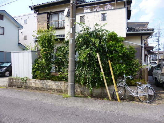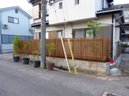 植木がお好きなお客様ですが、管理が大変になってきたのでソヨゴだけを地植えにして、イタウバ材ウッドデッキとたて格子フェンスで目隠しを創りました。材料寸法の関係でフェンス部はウリン材になりましたが、正面以外では視線が遮られます。京町屋の感じです。(施工途中ですが載せました。)