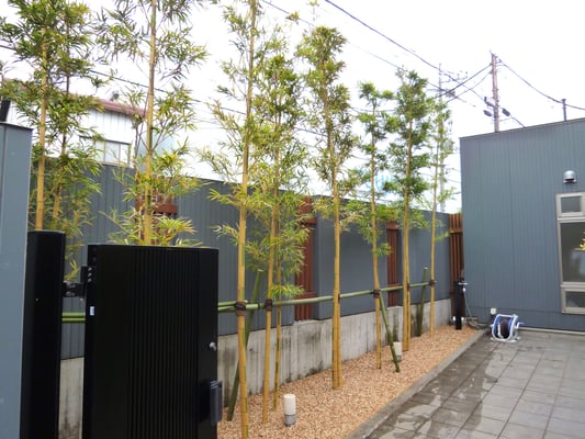 玄関にキンメイモウソウチクを植えました。グレーの縦目外壁デザインとの対比で一層綺麗な印象を